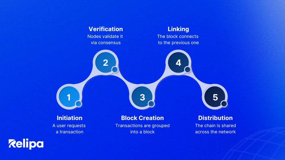 The operation of blockchain can be broken down into five steps: