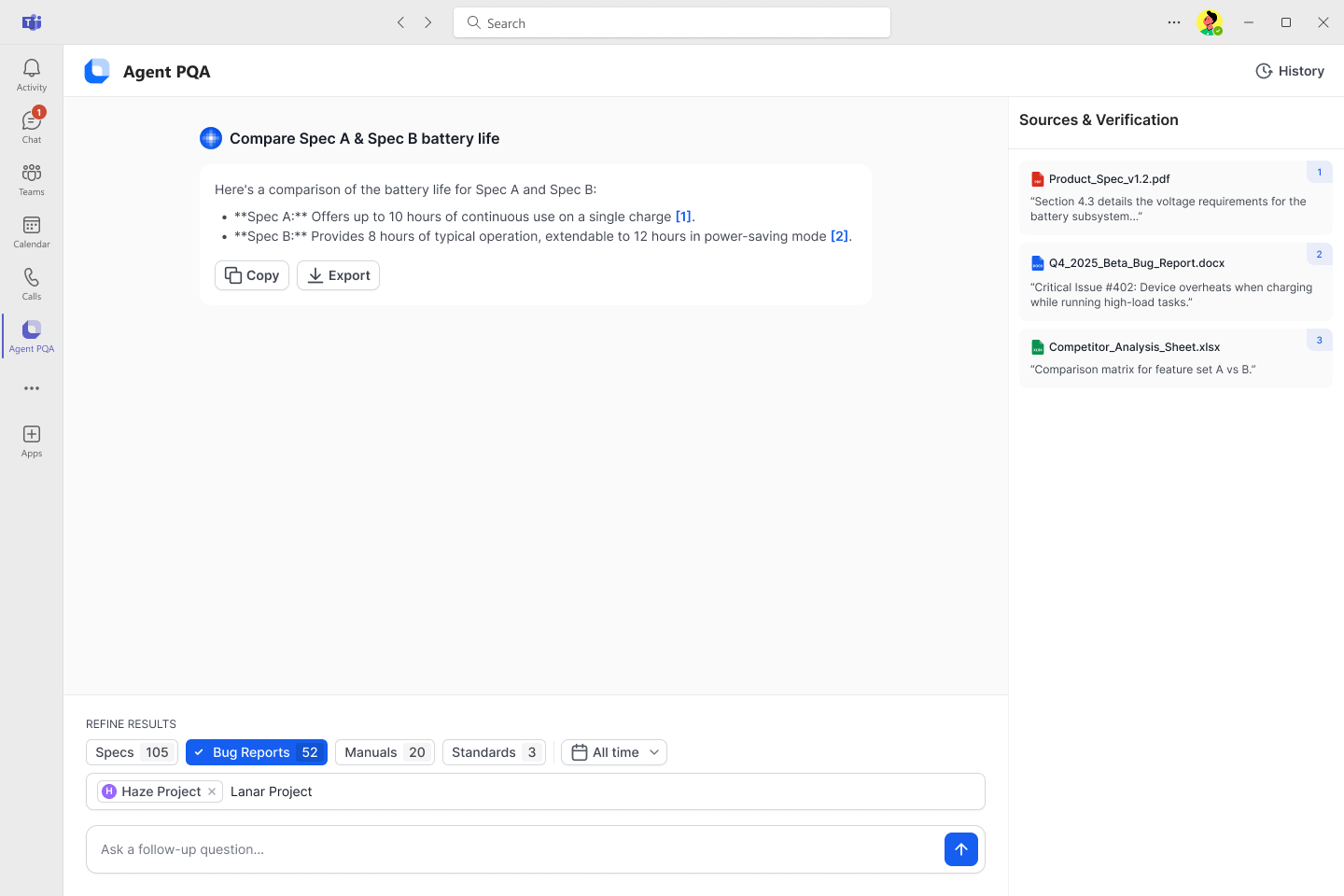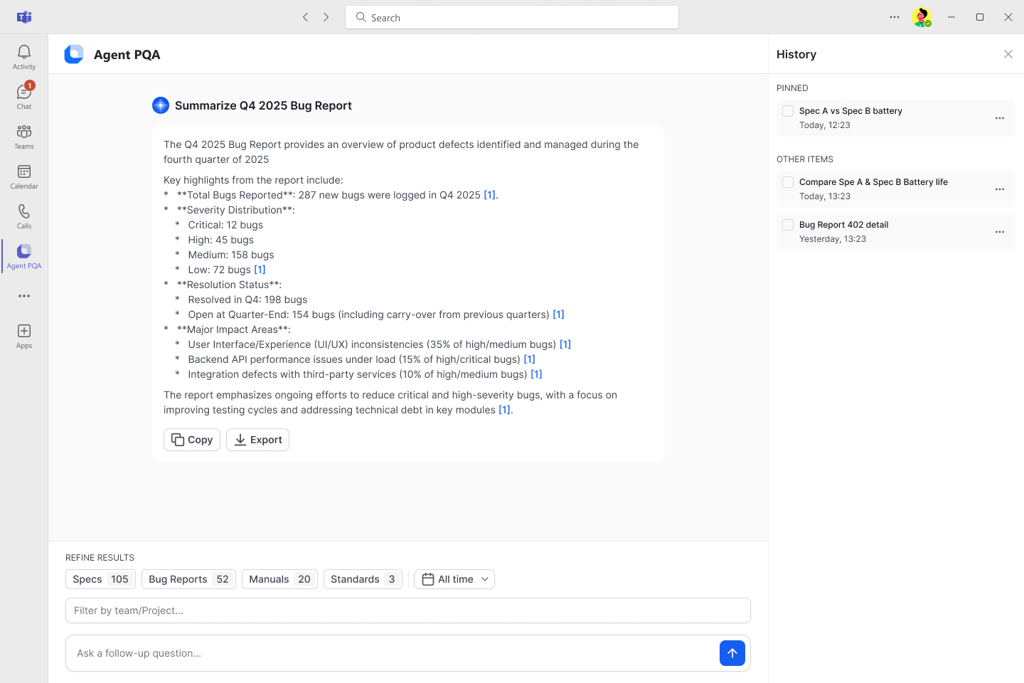 The AI Agent is embedded directly into Microsoft Teams, enabling employees to ask questions naturally, get instant PQA answers, and stay fully productive without switching tools or breaking their workflow.