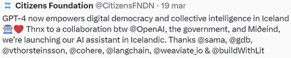 This is not about apps or tools that use GPT-4, so it’s a little different than the example above. In this case, we are talking about cooperation between OpenAI, the Icelandic government, the Citizens Foundation, and the Icelandic language technology company Miðeind ehf. Train GPT-4 in proper Icelandic Grammar and cultural knowledge.
