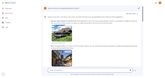• Google Bard users can now directly ask Bard to display images in search results. If you ask “What are the must-see sightseeing spots in Kyoto?”, you will get a kind answer with plenty of visuals in addition to the text, so you can better understand what you are looking for.