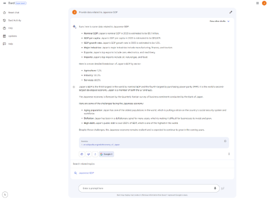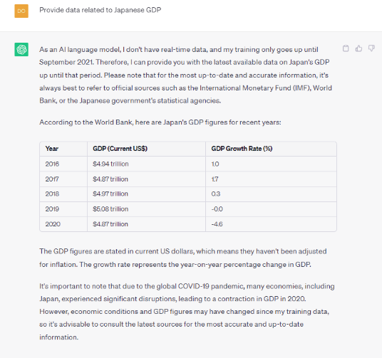 Upon close analysis of the responses provided by both ChatGPT 4 and Google Bard, ChatGPT provides an easy-to-read table of nominal GDP and growth rates. On the other hand, Google Bard can cite a source for the data that it provides. Bard can also provide predictions for 2023. By contrast, GPT-4 can only provide data for 2019 and 2021.