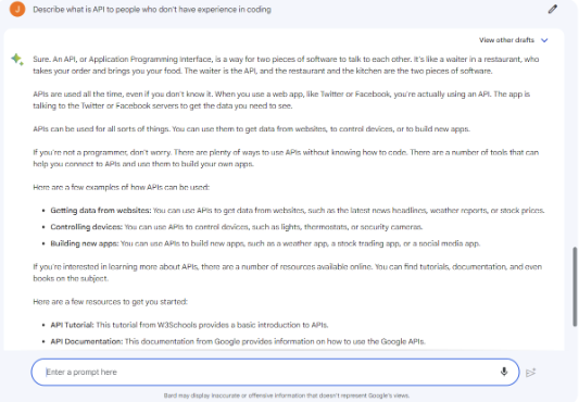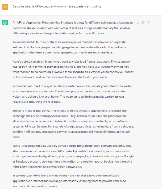 Both explanations are clear and concise, but ChatGPT’s answer provides a more detailed explanation of how APIs are utilized in software development. Apart from a comprehensive explanation, ChatGPT also provides easy-to-understand metaphors, such as “To understand APIs, think of them as messengers or translators between two separate entities. Just like how people use a language to communicate with each other, software applications also need a common language to communicate and share data”. By virtue of a digestible piece of information, non-technical readers can grasp a firm grounding of knowledge about API.