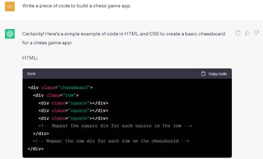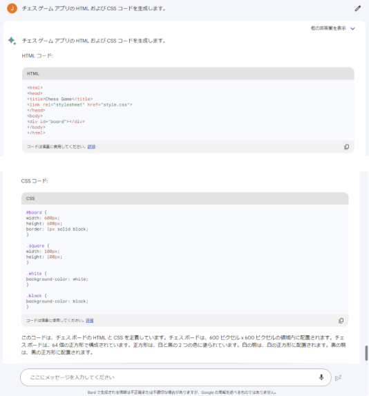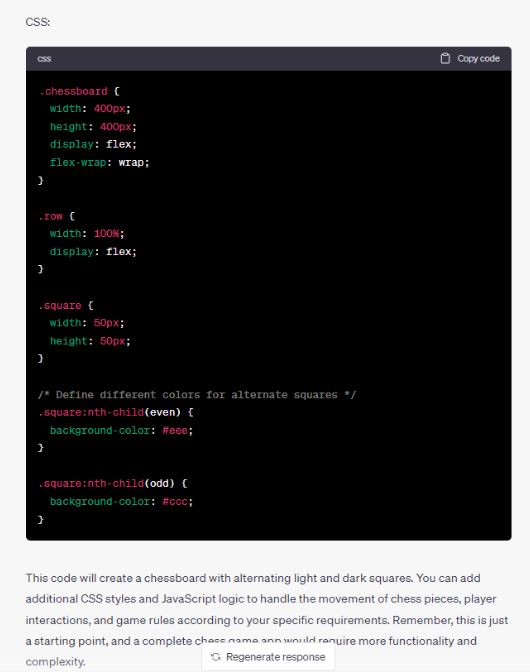 In contrast, the Google Bard reply simply presents the HTML and CSS of a basic 8×8 chessboard with no pieces. The chessboard layout is well established but falls short of providing the key details needed to create a fully functional chess game app.